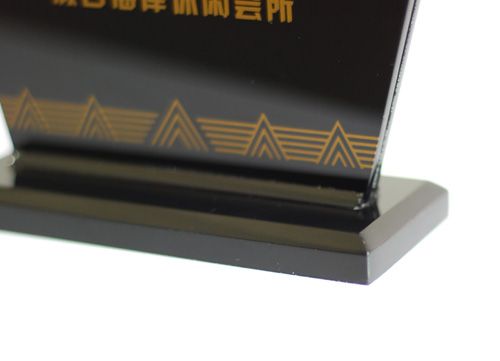 此款亚克力台牌采用3毫米和10毫米黑色亚克力制作而成,上面是由两块亚克力板粘接而成,亚克力板可丝印,两板之间有2毫米缝隙,适合摆放各种各样资料牌,黑色亚克力板材,表面洁亮有光泽,是一款高档美观的亚克力台牌。