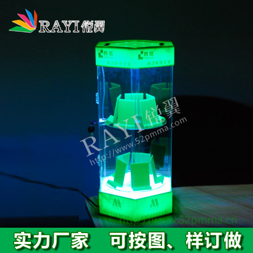 此款六边形旋转展示柜主要适用于移动电源产品的展示盒陈列,也适合其他小电子产品;360度旋转功能,全视角展示产品,上下可发光,能将要展示的产品照射的格外明亮突出,在电子市场能格外的引人注目,得到了移动电源等电子产品厂家的好评。