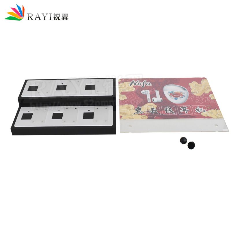 此款桌面蓝牙耳机展示架,采用3mm黑色加3mm透明板材通过开料,钻石 抛光,布轮抛光,锣机,镭雕,打孔,粘接,防刮手处理而成,亚克力是可以用于展览展示行业的塑胶材料,无色无味,整个展架通透靓丽。使用透明和黑色板制造蓝牙耳机展示架,陈列架,让人感觉卫生干净整洁,高端大气,绚丽的色彩,独特的造型构思充分的引起了顾客注意,使其驻足停留进而对广告中的商品产生浓厚的兴趣,最终能达到销售目的,能营造出欢快的气氛,起到推波助澜的效果!