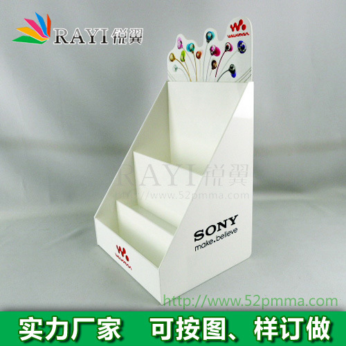 此款桌面亚克力幻彩蓝牙耳机展示架,采用5mm透明板材通过开料,钻石抛光,布轮抛光,锣机,镭雕,打孔,粘接,防刮手处理而成,亚克力是可以用于展览展示行业的塑胶材料,无色无味,整个展架通透靓丽。使用透明板制造幻彩蓝牙耳机展示架,陈列架,让人感觉卫生干净整洁,高端大气,绚丽的色彩,独特的造型构思充分的引起了顾客注意,使其驻足停留进而对广告中的商品产生浓厚的兴趣,最终能达到销售目的,能营造出欢快的气氛,起到推波助澜的效果!
